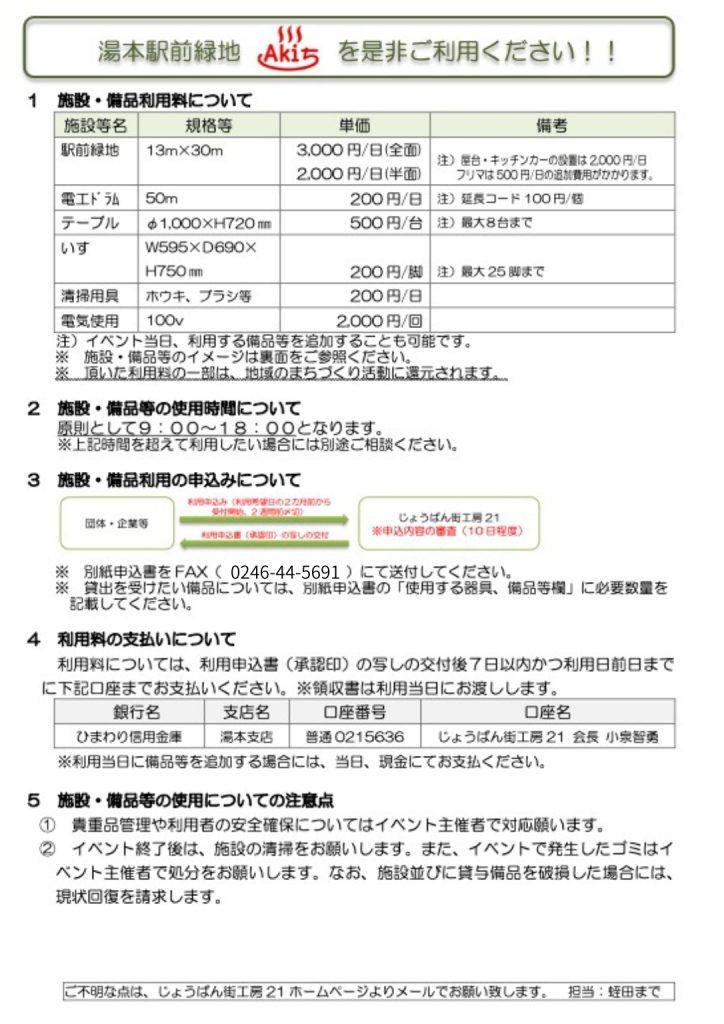 未来イメージ現在のAKIちガーデンテーブル じょうばん街工房21では、いわき市都市建設部とのパートナーシップ協定のもとで、JR湯本駅前の賑わいづくりを目的として、駅前緑地「AKIち(あきち)」の利活用を進めております。 朝市やフリマなどの収益イベントや、フラ教室の開催など、賑わいづくりにつながる集客イベントをお考えの方々に積極的に貸し出しを行います。 貸し出しによる収益は、「AKIち」の清掃、維持管理や備品の購入費用に充てさせて頂きます。 申込書をダウンロードして送付してください AKIち利用申込書.pdf